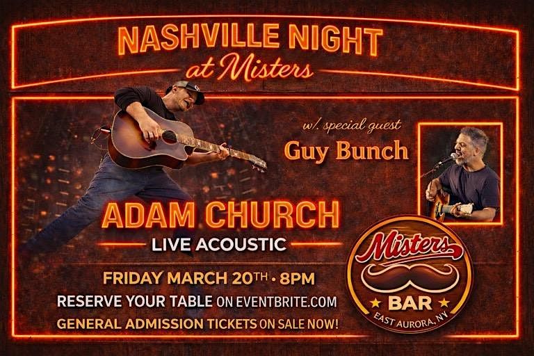 Step into Nashville Nights, an intimate acoustic country music evening featuring Adam Church with special guest Guy Bunch.