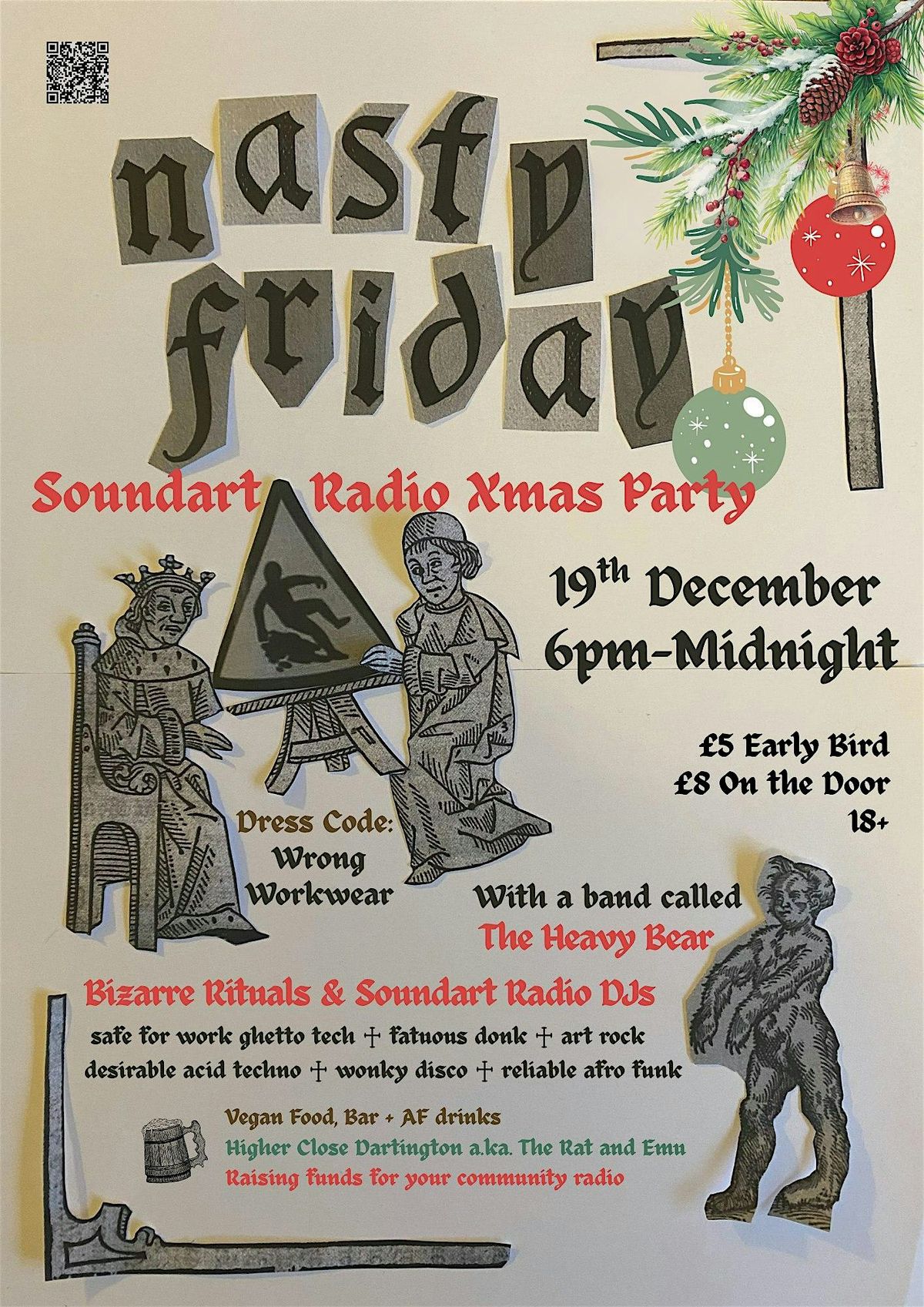 Soundart Radio 102.5fm invites you to down tools and join us on December 19th 2025 – the night of “Nasty Friday”– known as the most badly-behaved night on the British calendar. It’s on Nasty Friday that swathes of the population surge out of their workplaces pay packets in hand, giddy at the start of the xmas hols, seeking a night of revelry and chaos.