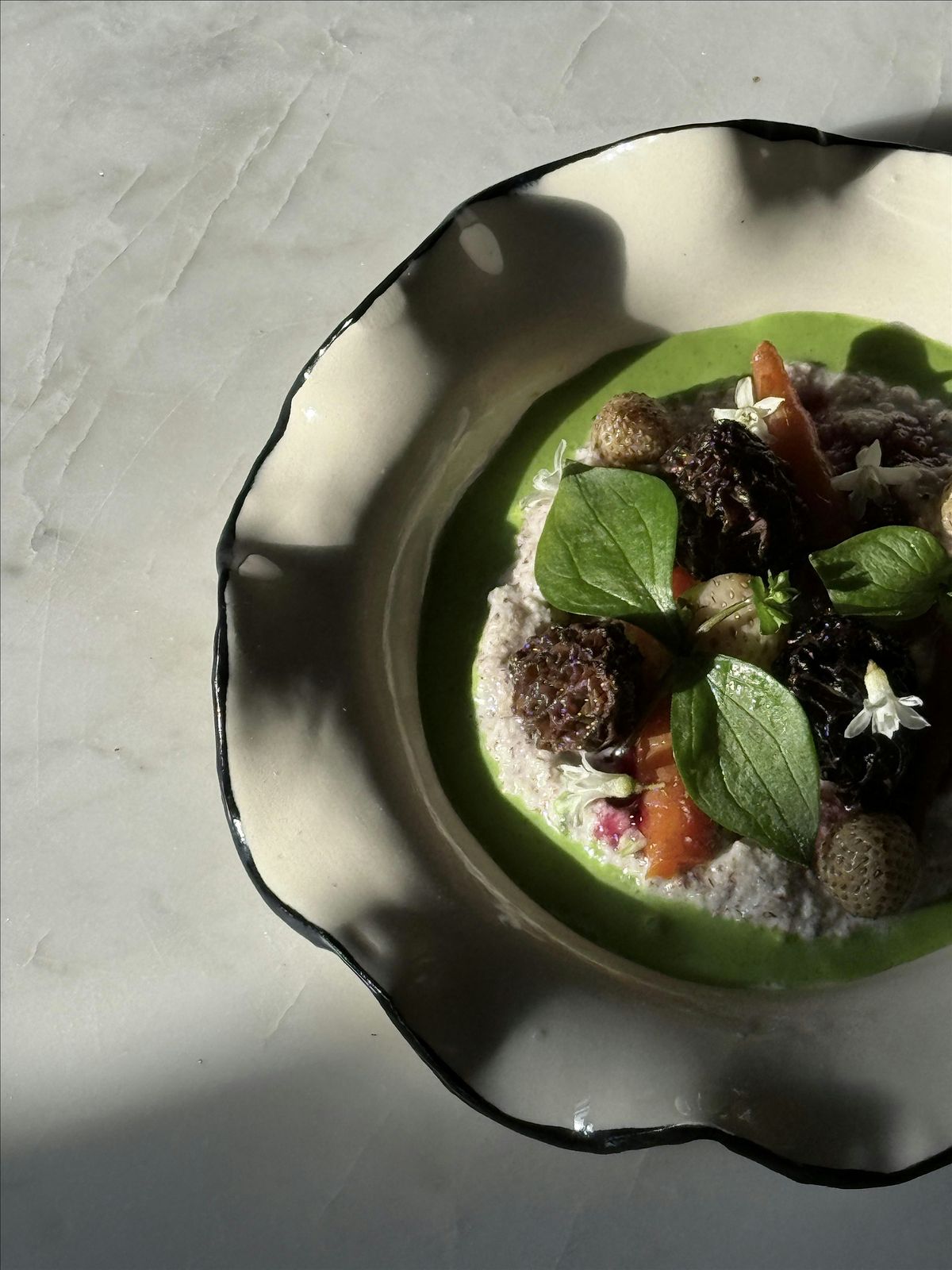 Local Hazelnuts ricotta, green strawberries, morels, flowering currant gel, wild sprouts, Seed crackers
