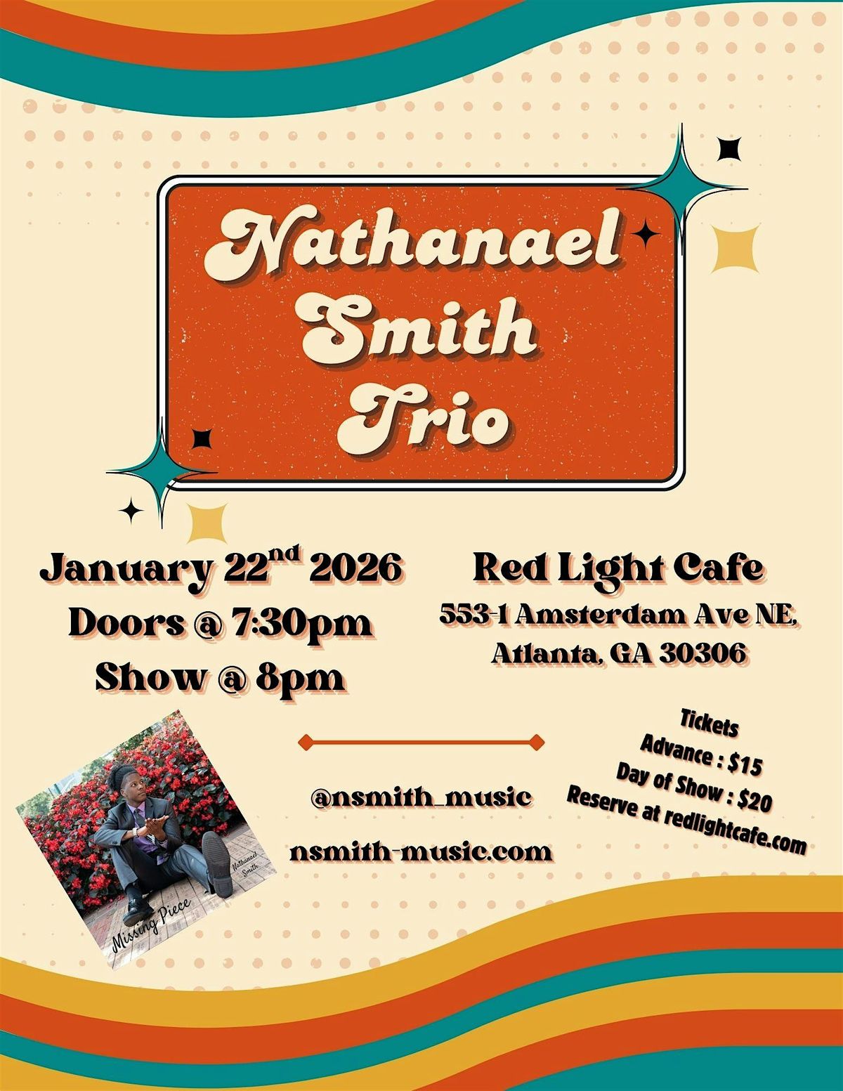 is back in town! Nathanael is a pianist raised in Stone Mountain, GA. He received a bachelor’s degree in jazz performance from Florida State University and a master’s degree in jazz studies from Georgia State University. He has been touring nationally and internationally with the Glenn Miller Orchestra since 2024 and is returning to the Red Light Café for a night of standards, originals, and arrangements with his own trio. It’s a night of music that you won’t want to miss!
