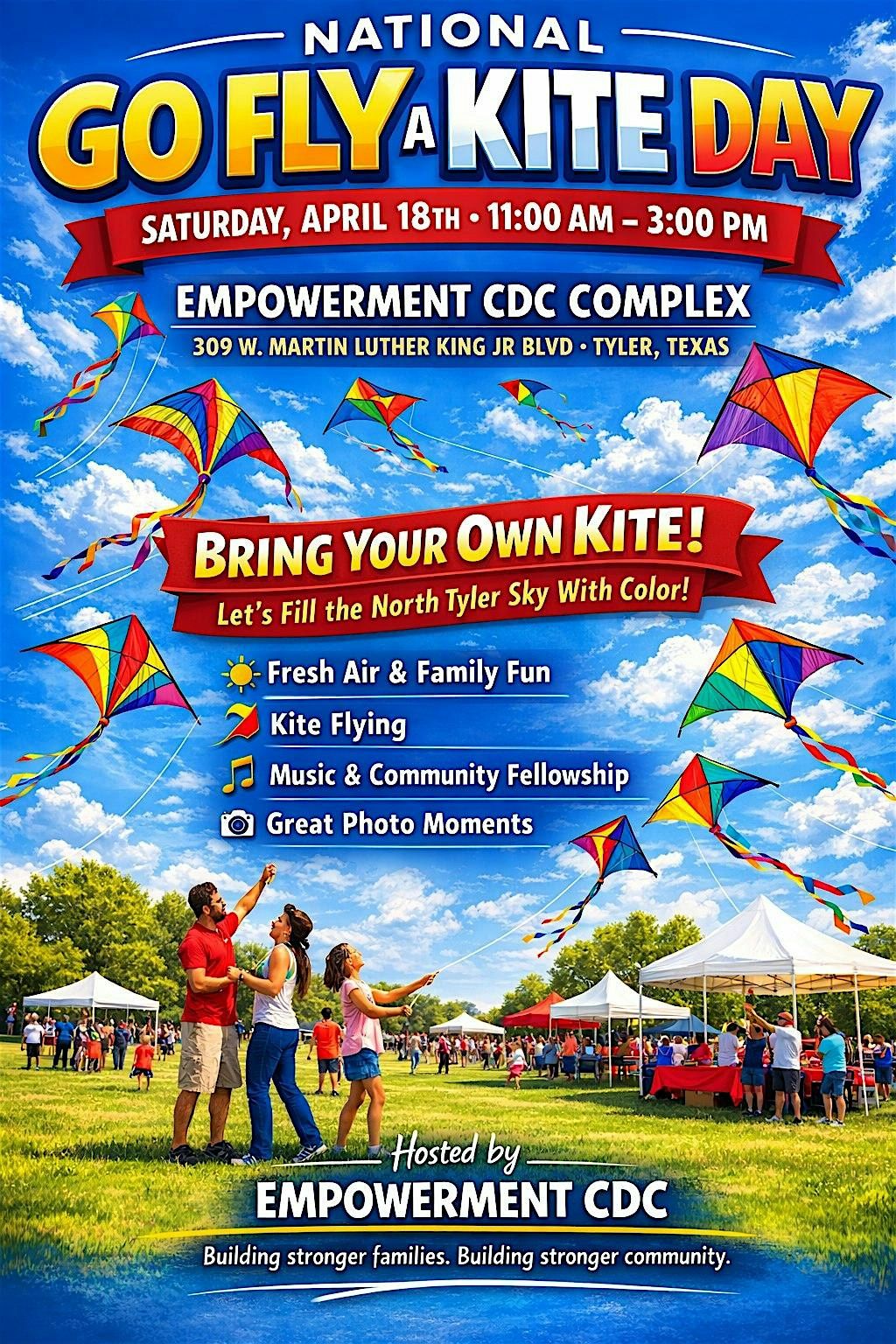 Tyler, Texas – The Empowerment CDC is excited to invite families, neighbors, and community members to celebrate National Go Fly a Kite Day on Saturday, April 18th from 11:00 AM to 3:00 PM at the Empowerment CDC Complex, 309 W. Martin Luther King Jr. Blvd, Tyler, Texas.