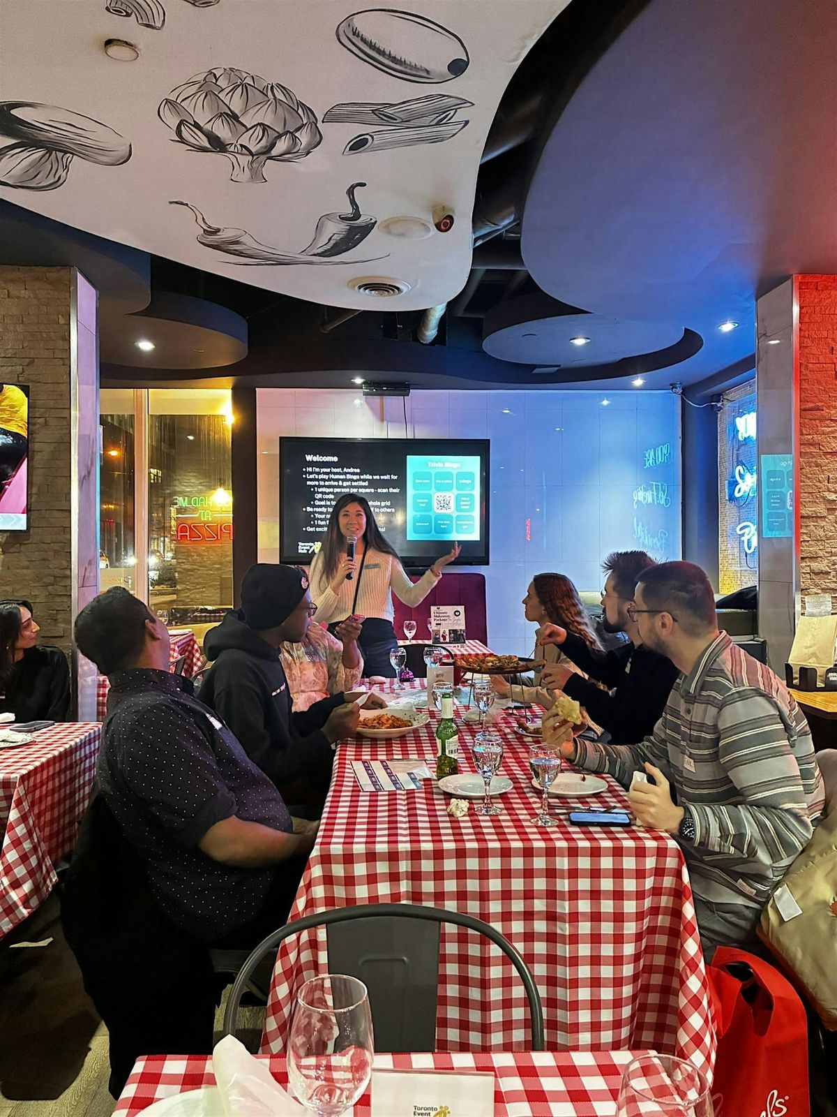 We'll be opening up the event with a group icebreaker and then play an interactice trivia in teams (to encourage you to make friends). Then you'll have time to mix & mingle and enjoy the delicious pizza (one slice 🍕included). The prize to win is a bottle of wine to share at the event!