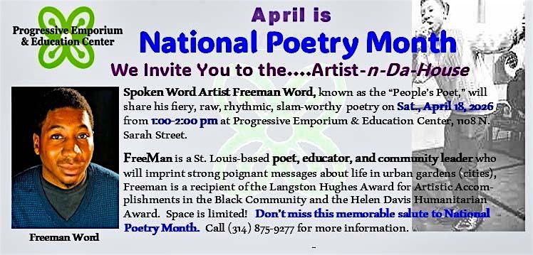 April is National Poetry Month, an opportunity to celebrate the historic contributions and achievements of Black poets. We invite you to the Artist In Da House with Spoken Word Artist Freeman Word at 1 p.m., on Saturday, April 18, 2026 at Progressive Emporium, 1108 N. Sarah Street.