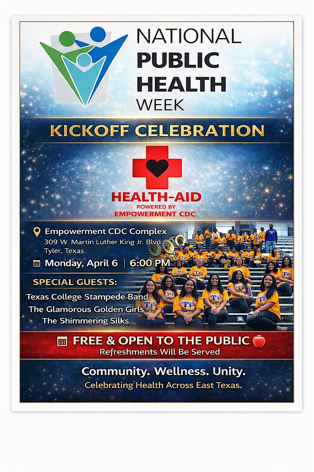 The celebration will feature live performances by the Texas College Stampede Band, the Glamorous Golden Girls, and the Shimmering Silks, bringing energy and excitement to an evening focused on strengthening community health across East Texas.