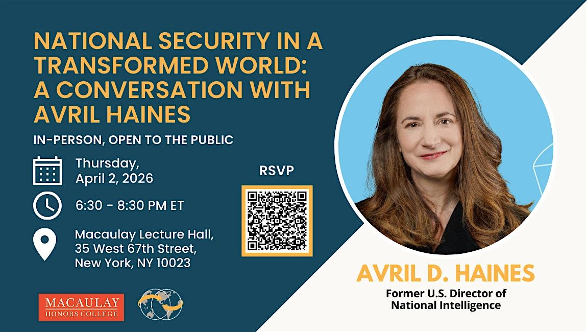 Join us on Thursday, April 02 from 6:30 to 8:30 PM ET at Macaulay Lecture Hall, 35 West 67th Street, New York, NY, 10023 for an in-person discussion with Avril Haines, former U.S. Director of National Intelligence and current Carnegie Distinguished Fellow at Columbia SIPA, to explore the future of national security and the impact of U.S. strategy on the global stage.