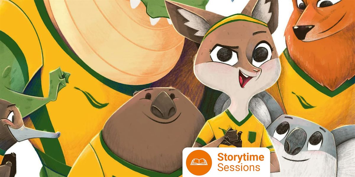 [Image Description: Illsutration from Luna Roo the Kangaroo Baller - native animals wearing a soccer outfit. Text reads Storytime Sessions. ]