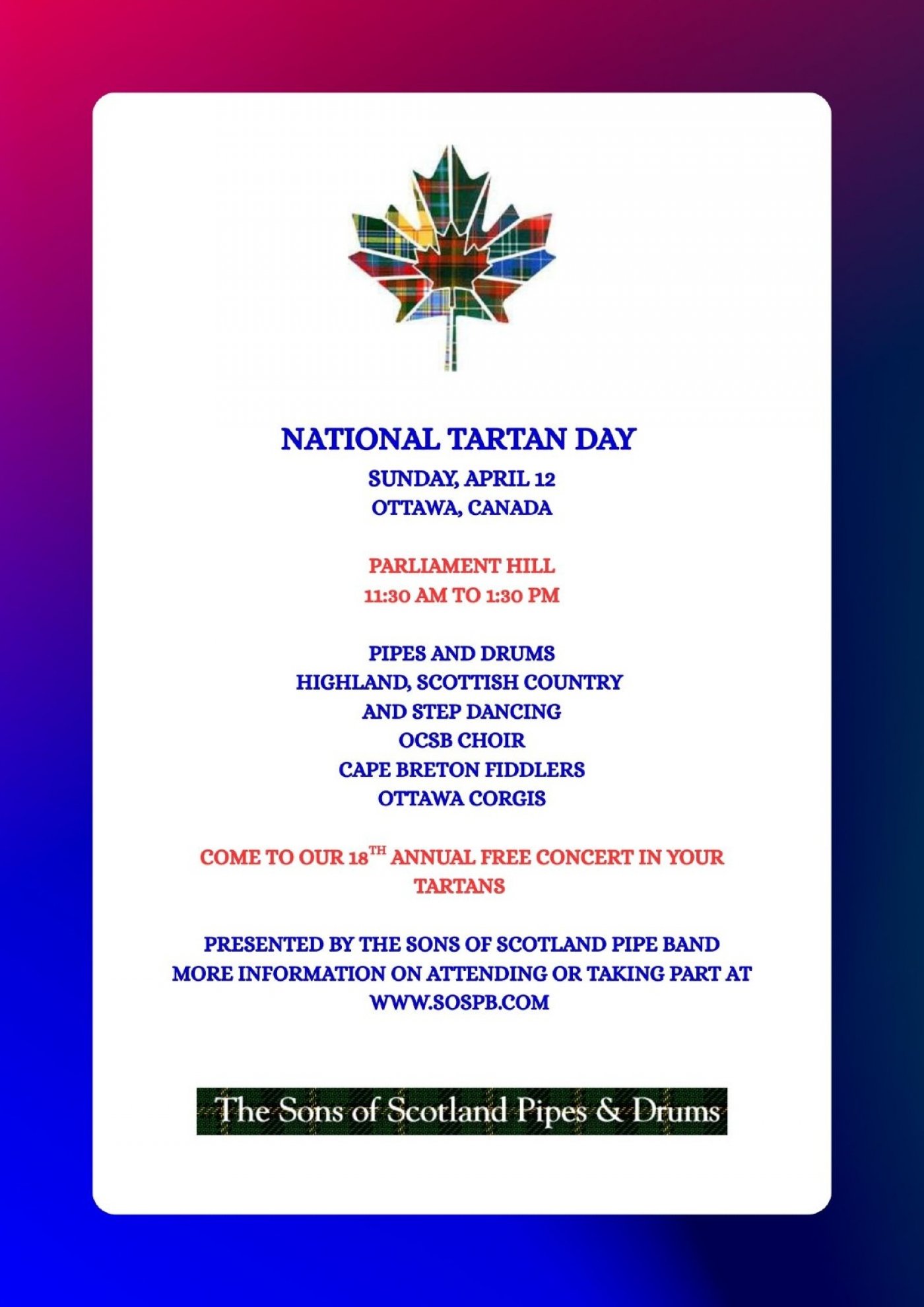 We hope to see you at the 18th annual National Tartan Day show presented by the Sons of Scotland Pipe Band of Ottawa.