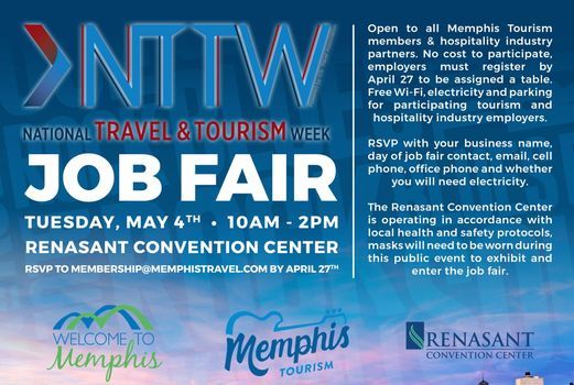 Open to all Memphis Tourism members & hospitality industry partners. No cost to participate, employers must register by April 27 to be assigned a table. Free Wi-Fi, electricity and parking for participating tourism and hospitality industry employers. Employers: