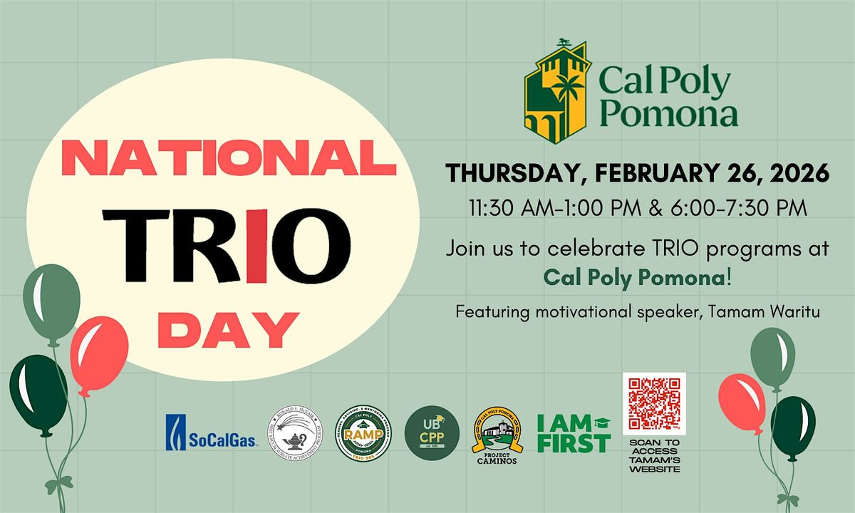 Come join us for an engaging and inspirational day celebrating TRIO programs! The celebration will include two events on February 26, 2026 at 11:30 AM-1:00 PM at the Student Services Building Building 121, Room 1967-69 and 6:00 PM-7:30 PM at Collins College Building 80, Room 100. Let's come together to recognize TRIO's positive impact and enjoy some great company. See you there!