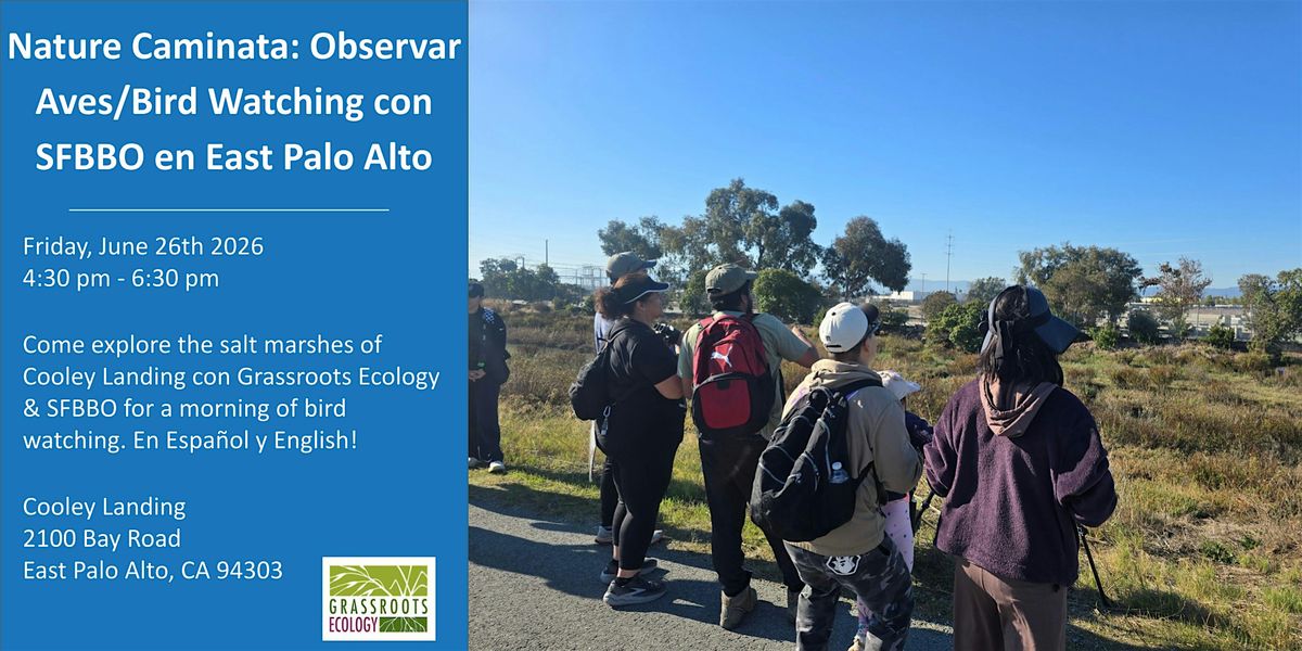 ¡Únete a Grassroots Ecology y San Francisco Bay Bird Observatory para pasar un día de otoño en las marismas y aprender sobre las especies de aves de la región! Disfrute de una mañana de observación de aves en Cooley Landing y Ravenswood Open Space Preserve mientras recorremos los jardines nativos del parque y nos aventuramos en la marisma salina.