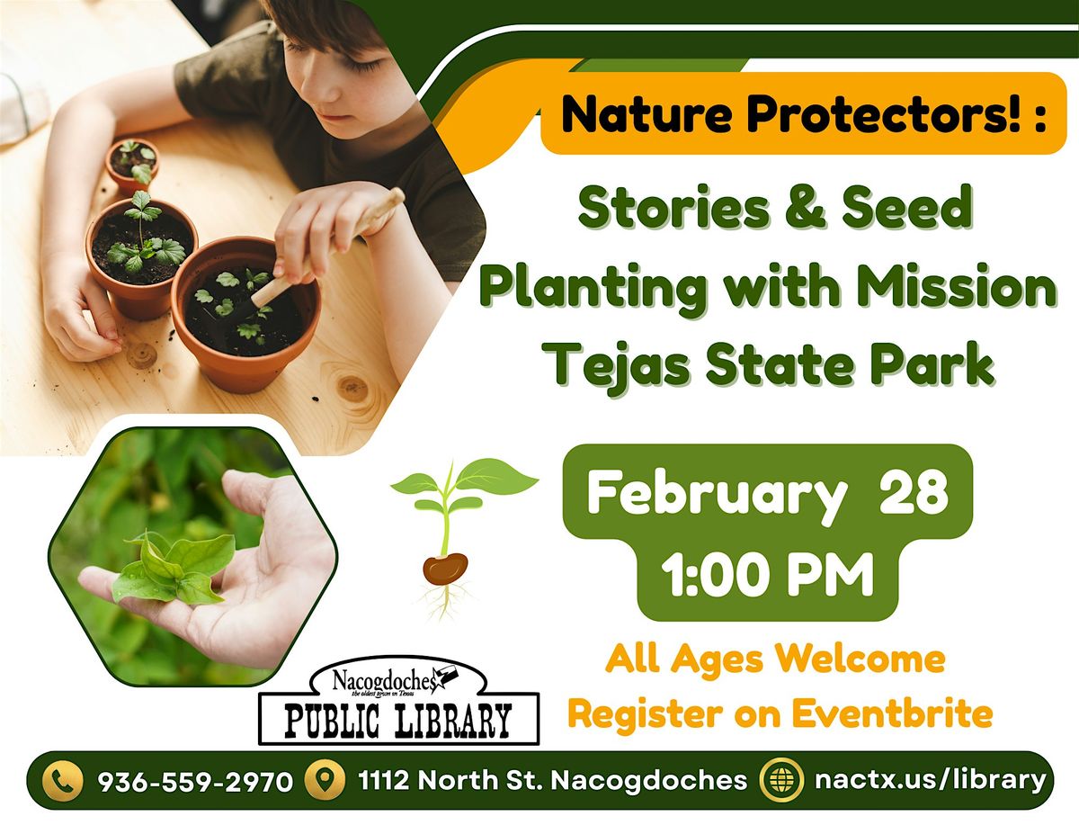 Meet a Ranger from Mission Tejas State Park for a special storytime and hands-on planting activity! Explore nature, growth, and how we can care for the world around us. All Ages!