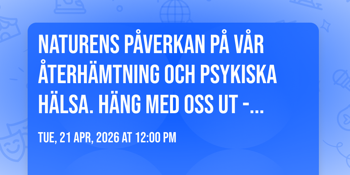 Gratis och rabatt på lunchen om du vill äta efteråt.Friluftsfrämjandet gästar oss och berättar om metoden Häng med oss ut – ett arbetssätt som bygger på forskning om naturens betydelse för hälsa, återhämtning, meningsfull aktivitet och kamratstöd. Genom enkla friluftsaktiviteter stödjer metoden människor med psykisk ohälsa i deras återhämtningsresa. Den används idag i ett 60-tal verksamheter runt om i landet, bland annat inom socialpsykiatri, vård, skola och rehabilitering.