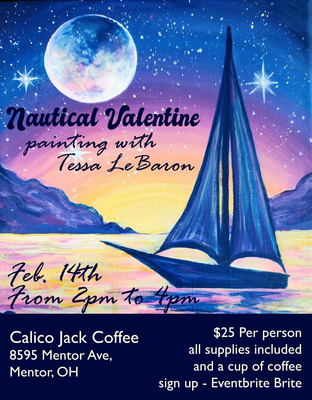 Ready for a fun valentines date before dinner? Join us for a nautical-themed Valentine’s paint and sip class! Whether you're a pro or just want to unwind, Tessa LeBaron will guide you step-by-step to create your own nautical space masterpiece while you enjoy some tasty drinks. Perfect for friends, couples, or solo adventurers looking to get creative and have a blast. Don’t miss this chill, artsy evening! One drink is included in purchase price.