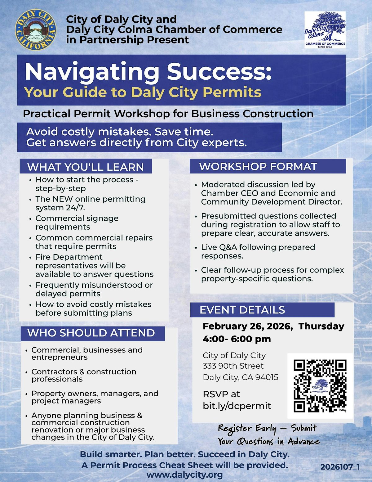 Avoid costly mistakes. Save time. Get answers directly from City experts. Build smarter. Plan better. Succeed in Daly City. A Permit Process Cheat Sheet will be provided.