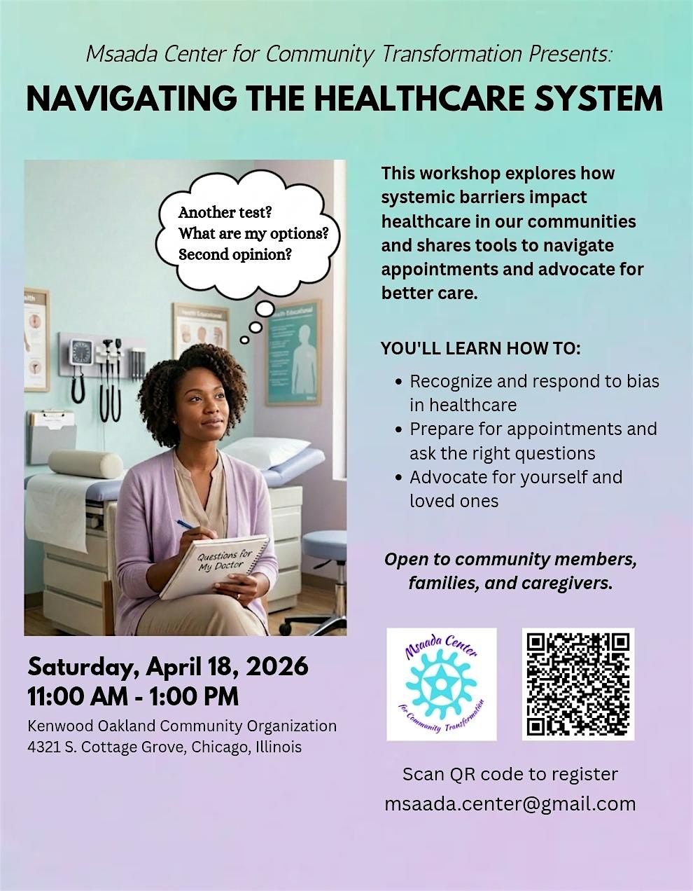 This interactive workshop explores how historical and systemic barriers have shaped healthcare experiences in our communities while providing practical tools to navigate appointments, ask informed questions, and advocate for quality care.