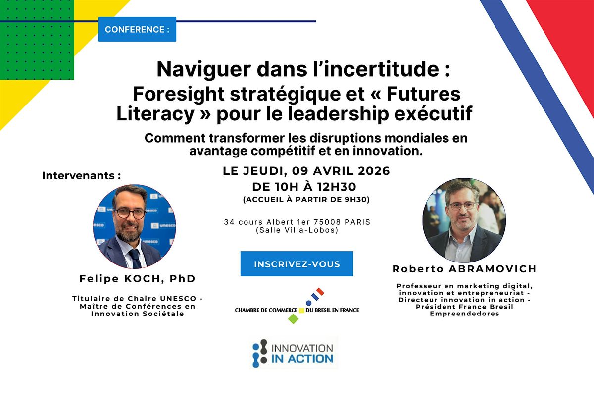 Cette conférence propose une immersion stratégique pour transformer les ruptures mondiales en leviers de croissance et d'innovation. Le programme explore l'obsolescence des modèles de planification traditionnels face aux transitions technologiques, climatiques et géopolitiques actuelles, marquant ainsi la fin du "Business as Usual". À travers les concepts de Futures Literacy (alphabétisation aux futurs) et de Strategic Foresight, les participants apprendront à cartographier les signaux faibles et à construire des scénarios prospectifs. L'objectif central est de maîtriser l'art d'utiliser le futur comme un outil de décision au présent, notamment via la méthode du Backcasting, afin de renforcer la résilience et la compétitivité des entreprises au sein de l'écosystème franco-brésilien. La session se conclura par un débat exécutif favorisant l'intelligence collective sur les défis spécifiques des secteurs de l'industrie et des services.
