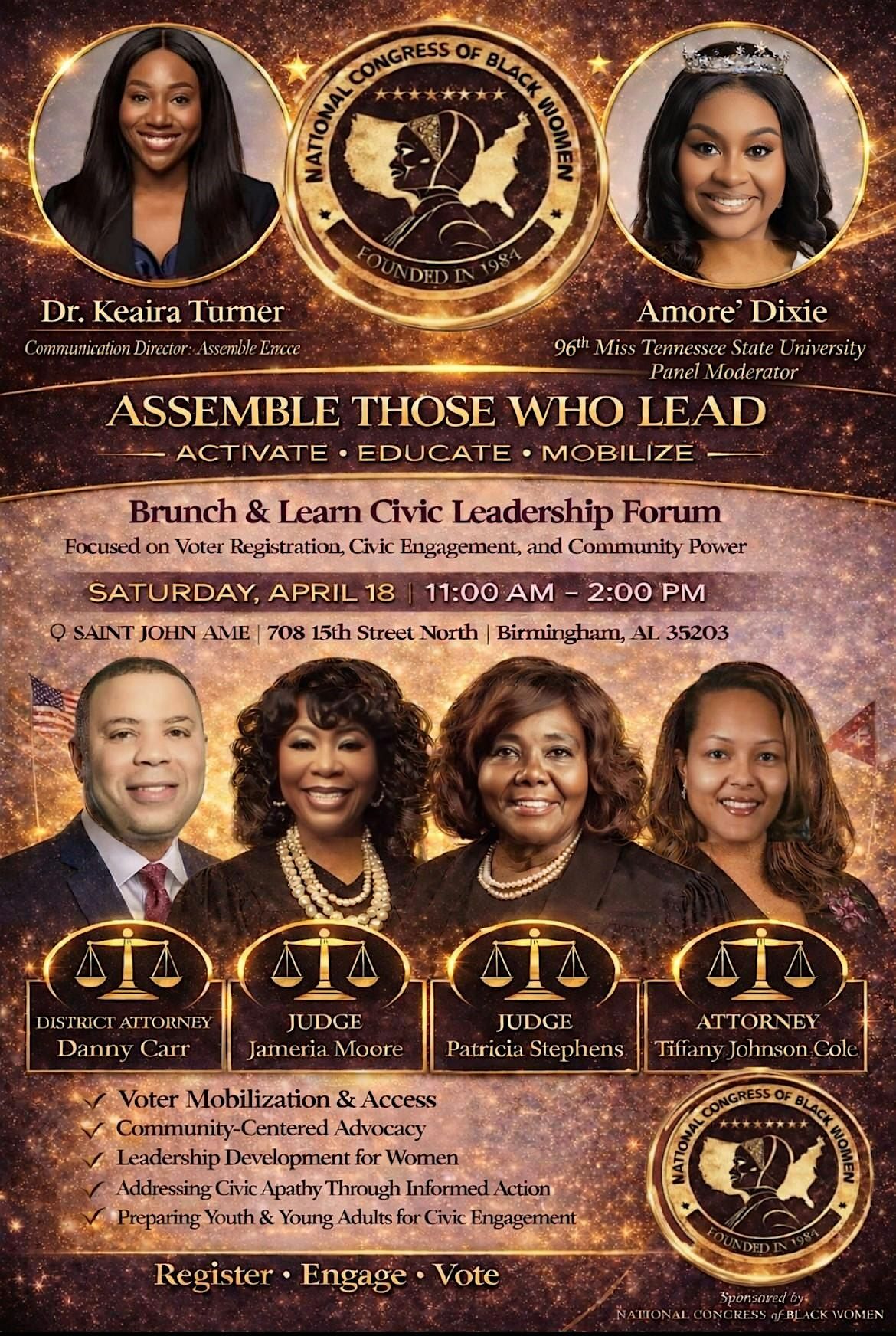 The Assemble Those Who Lead: Brunch & Learn Civic Leadership Forum is an empowering community event focused on voter registration, civic engagement, and strengthening community leadership. Hosted by the National Congress of Black Women, this dynamic gathering brings together distinguished legal leaders, community advocates, and emerging voices to educate, activate, and mobilize our communities.
