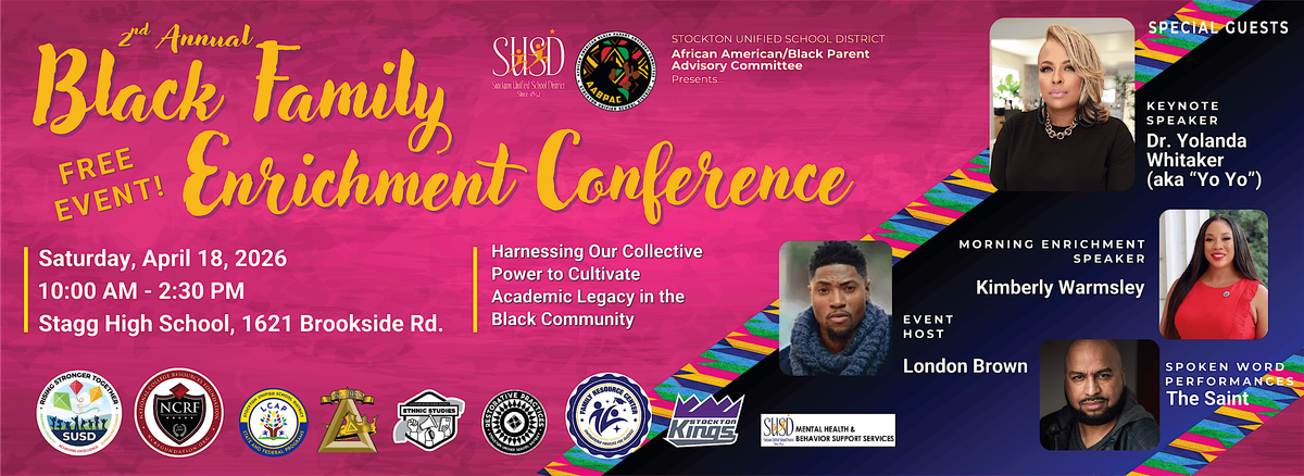Hip Hop Legend YO-YO and Actor/Comedian London Brown (Uncle Marvin/Raising Kanan) will be our amazing hosts for Black Family Enrichment Conference-A Day to Remember! Join us at Stagg High School on April 18, 2026 at 10:00 AM (Pacific Time) for an awesome day celebrating Black families! This event is all about connection, fun, and learning together. Don’t miss out on great activities, inspiring talks, and a chance to meet others in the community. Bring your family and enjoy a welcoming, uplifting atmosphere. See you there!