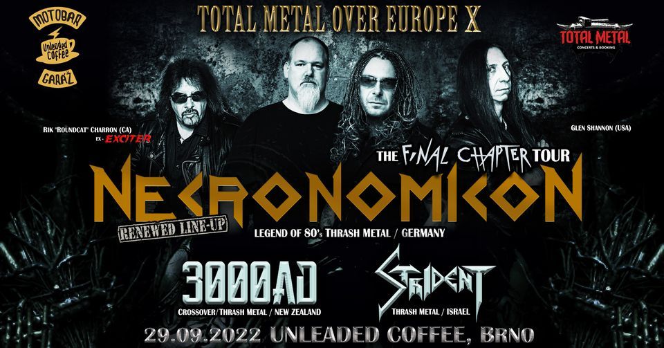 Thrashová legenda Necronomicon z Německa je zpět a dorazí zahrát opět do Unleaded Coffee v Brně V NOVÉM TERMÍNU 2022. Psal se rok 1984, kdy světlo světa spatřila debutova deska ''NECRONOMICON'' od té chvíle se kapela nezapomenutelně zapsala do Historie THRASH METALU!