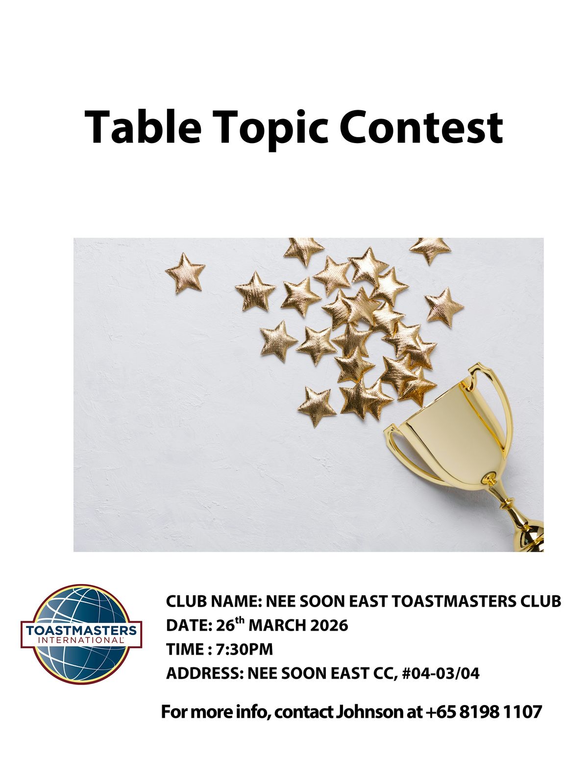 Ready to think on your feet? Join us in person for the Table Topics Contest hosted by Nee Soon East Toastmaster Club! It's a fun, fast-paced event where impromptu speaking takes center stage. Whether you're a seasoned speaker or just curious, come enjoy the exciting challenges and cheer on contestants as they tackle surprise topics with wit and confidence. Don't miss out on an evening full of laughs and inspiration!