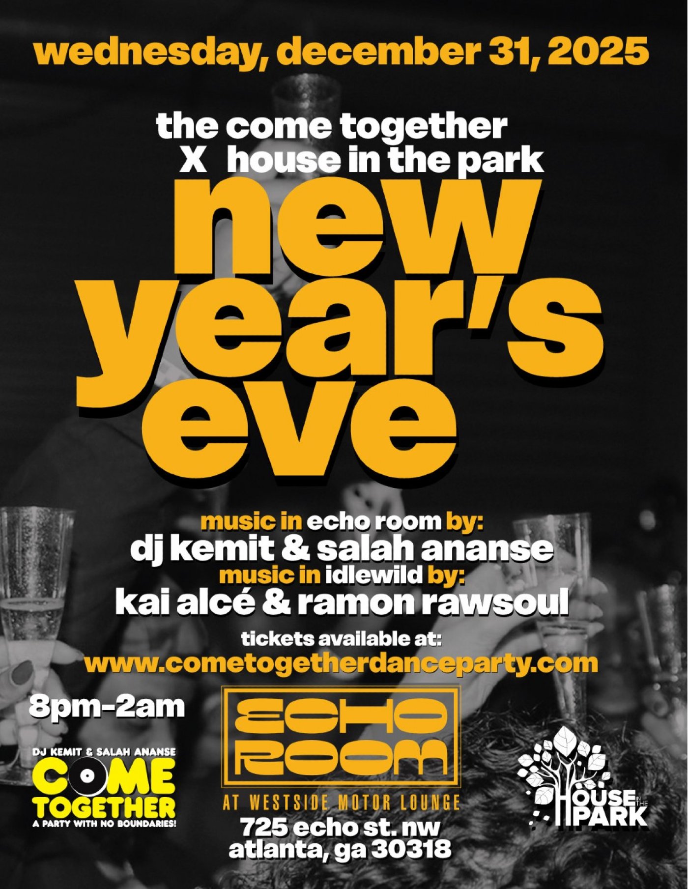 When New Year’s Eve rolls around, Westside Motor Lounge turns the dial all the way up with a day-to-night celebration rooted in rhythm. On Wednesday, December 31, festivities begin at 12 p.m. with a Widespread Panic Pre-Party hosted by Moontime Market, featuring live performances from the Sam Holt Band and Cameron Williams. As night falls, the energy shifts into a jam like no other as two Atlanta mainstays, Come Together and House In The Park, join forces for a New Year’s Eve bash spanning genres, generations, and two rooms of music. In The Echo Room, Come Together founders DJ Kemit and Salah Ananse take over with all-vinyl sets moving seamlessly through soul, funk, classic hip-hop, house, Latin sounds, and Afrobeats. Over in Idlewild, House In The Park residents Kai Alcé and Ramon Rawsoul deliver deep, soulful selections of house, disco, and Afro rhythms. Inspired by Atlanta’s most cherished dance floors and parties of the past, the night leans into connection over curation—no pretension, just DJs who know how to guide a room and let the music do the talking. Craft cocktails flow, moments are captured at the AFROTOPIA NYE Photo Booth, and a champagne toast at midnight marks the turn of the year. The Widespread Panic Pre-Party is free and open to the public. Tickets for the New Year’s Eve night event are $35 in advance and $45 at the door before 10 p.m. Tickets can be purchased here. Westside Motor Lounge is located at 725 Echo Street NW, Atlanta, GA 30318. Free parking is available. For more information, visit www.westsidemotorlounge.com or call 678-388-9536. Stay connected on Instagram at @westside_motor_lounge and Facebook at facebook.com/westsidemotorlounge. Echo Room at Westside Motor Lounge is open Thursday through Saturday with no cover fee. Stay connected on Instagram @echoroomatl and on Facebook at https://www.facebook.com/echoroomatl/.