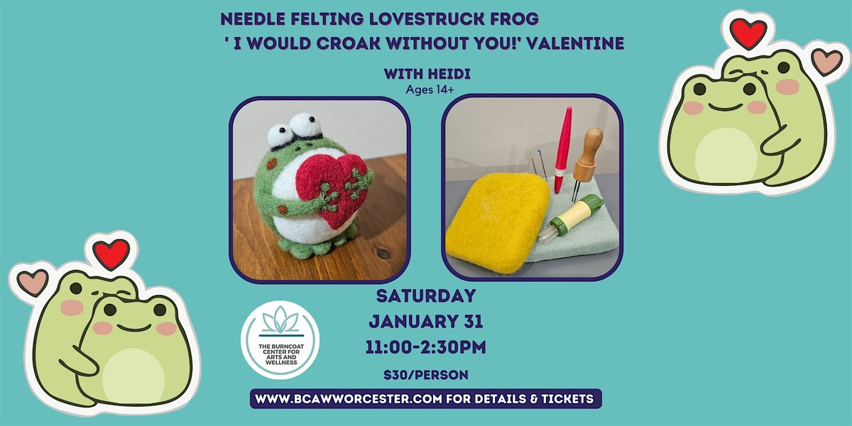 Learn to needle felt by creating this adorable lovestruck frog. You will be using all wool and barbed needles. This cutie measures about 4 inches. You will find this class to be a beginner/intermediate level. All materials are included.