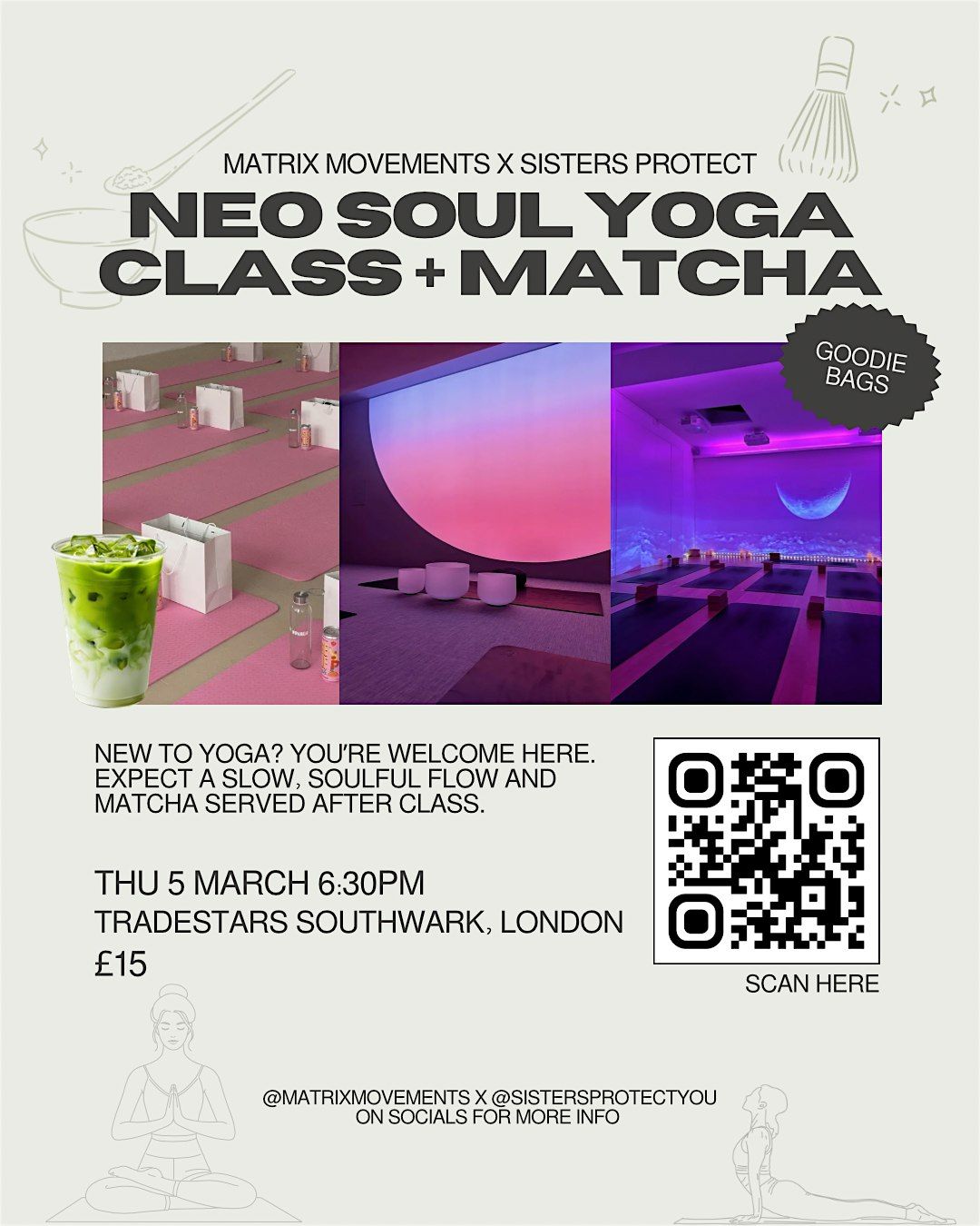 Matrix Movements and Sisters Protect invite you to an evening of neo-soul yoga, ceremonial matcha, and meaningful connection, created for women balancing ambition, responsibility, creativity, and very full calendars. Led by Shelay Matrix the owner of Matrix Movements, and Wesleigh Jane the founder of Sisters Protect.
