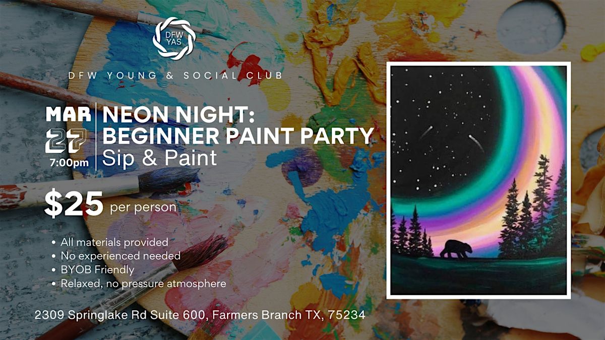 This is a guided, sip-and-paint-style class where we’ll walk everyone step by step through a featured neon painting using vibrant, glow-inspired colors that pop under the lights.