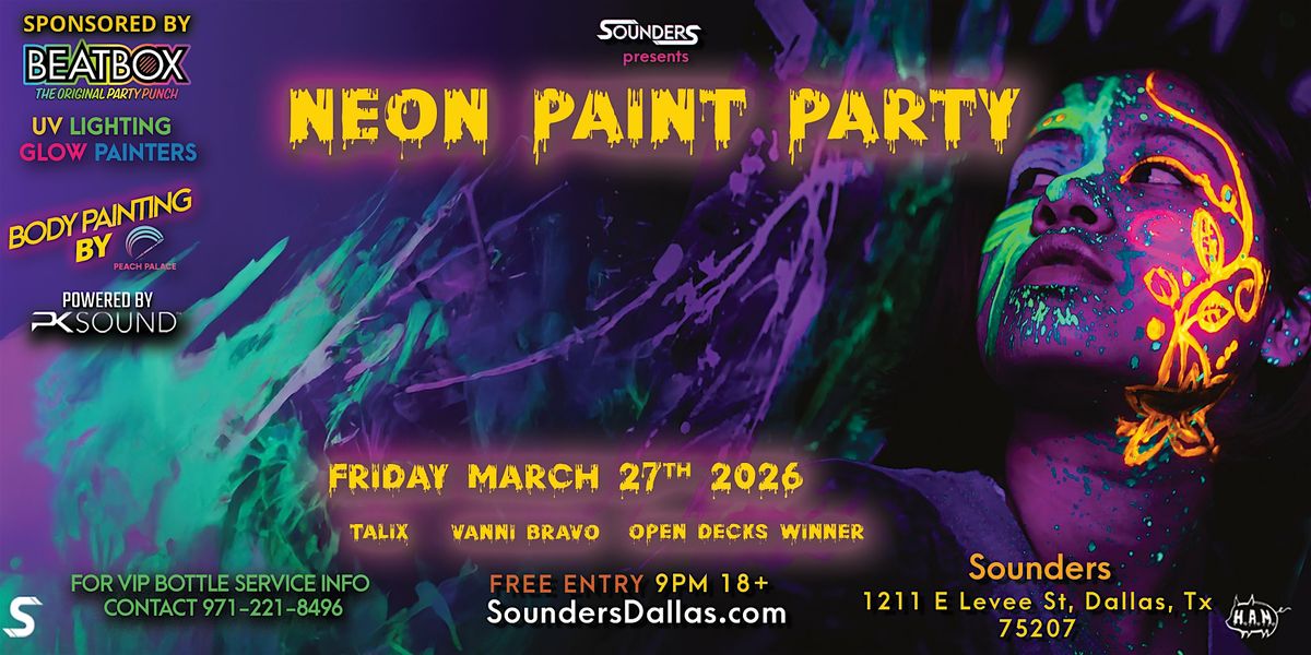 Get ready to glow all night at Dallas' hottest new venue โ Sounders โ for a Neon Paint Rave like no other! Whether you're into house, dubstep, or EDM, this night is about turning up the energy and lighting up the dance floor.