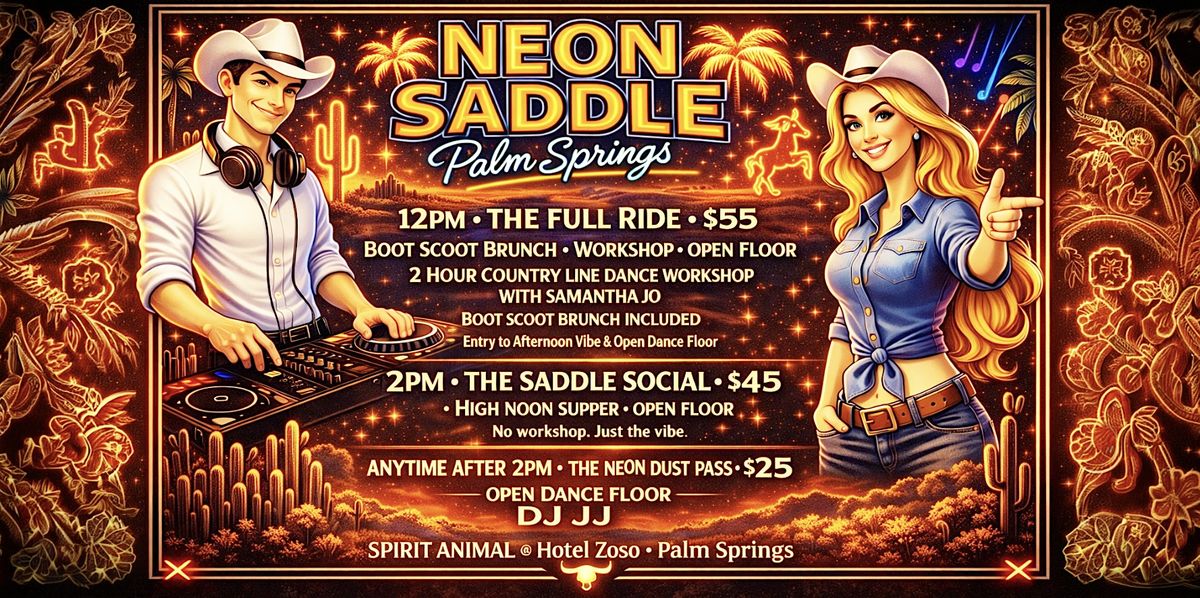 At 2PM, Neon Saddle transforms into a high-energy country dance floor hosted by DJ JJ.