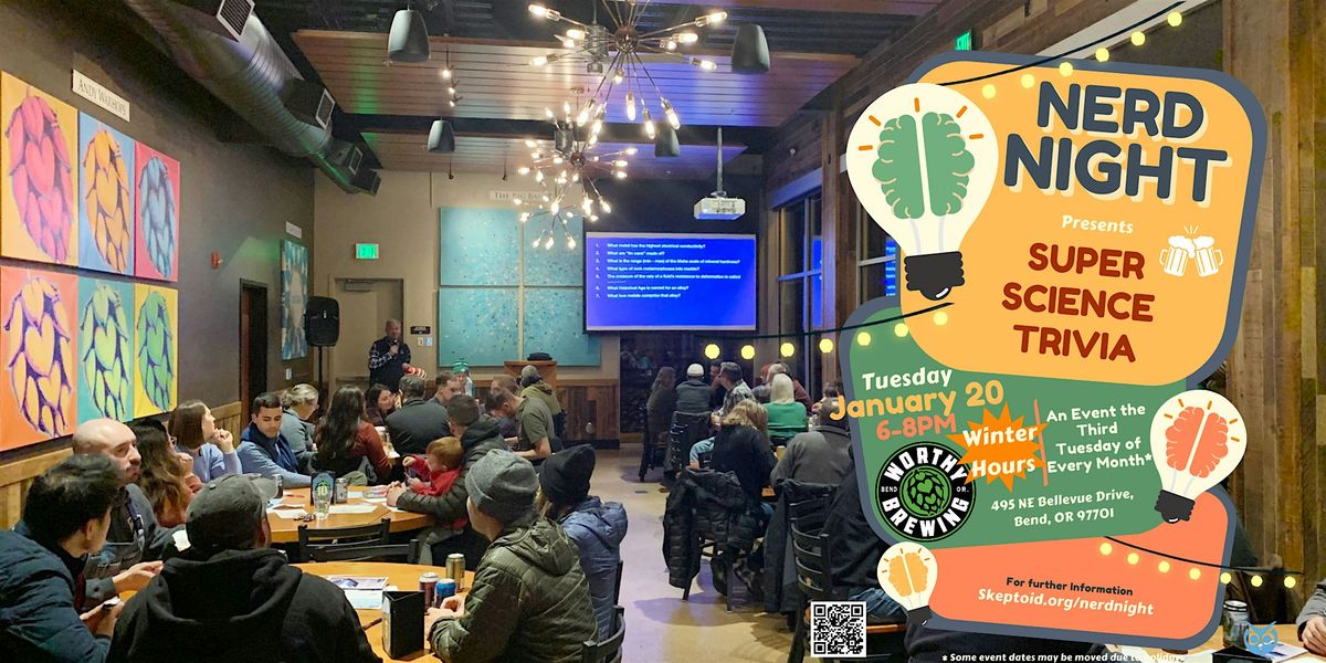 Grab your friends, learn something new, and compete for the title of ultimate Nerd Night science trivia champion. Expect an evening filled with mind-boggling questions, laughter, and plenty of local brews to add to the fun. Winners get their choice of cool Skeptoid prizes!