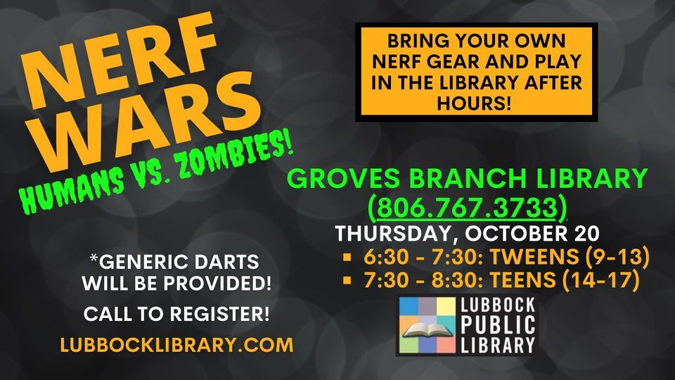 Bring your nerf gear and celebrate Halloween with a special Humans vs Zombies themed nerf wars! Generic darts and light refreshments provided.6:30-7:30, Tweens (Ages 9-13)