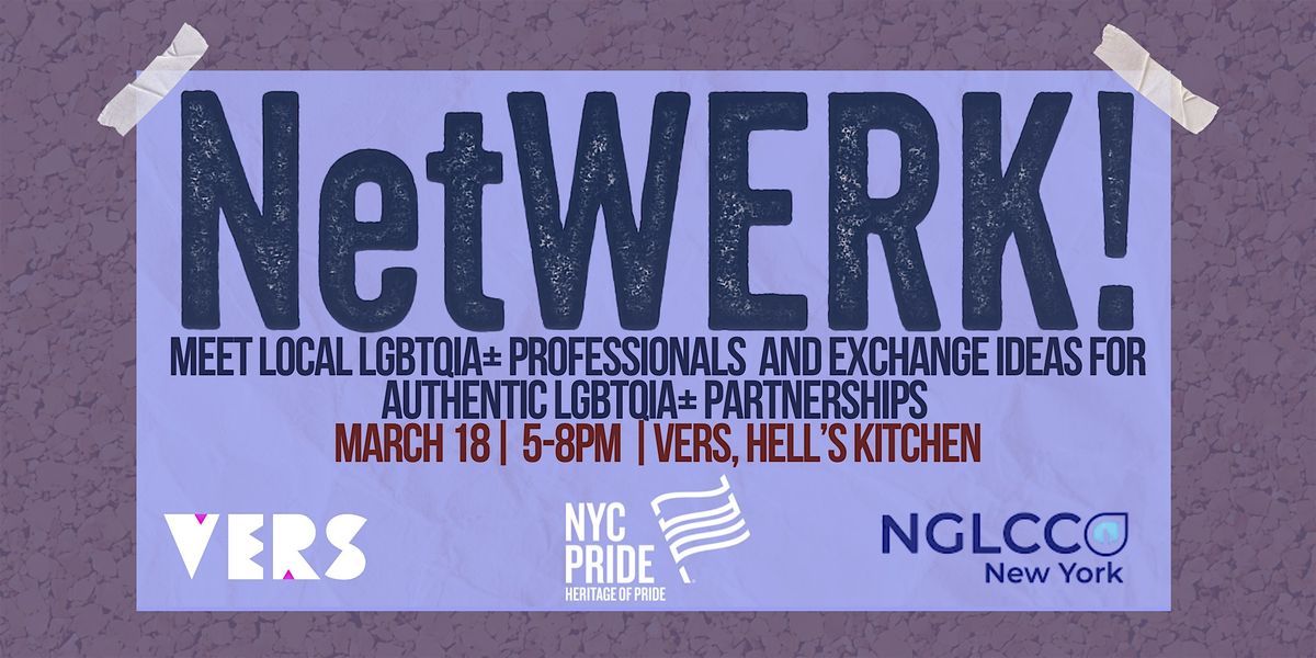 Join us at VERS in Hell's Kitchen on Wednesday, March 18th from 5:00 - 8:00 pm. You'll have the opportunity to make valuable new connections, learn more about local Pride programs and resources, and exchange ideas for authentic LGBTQIA+ partnerships all year long. We'll also have some activities and DIY Pride merch activations brought to you by nglccNY partner businesses.