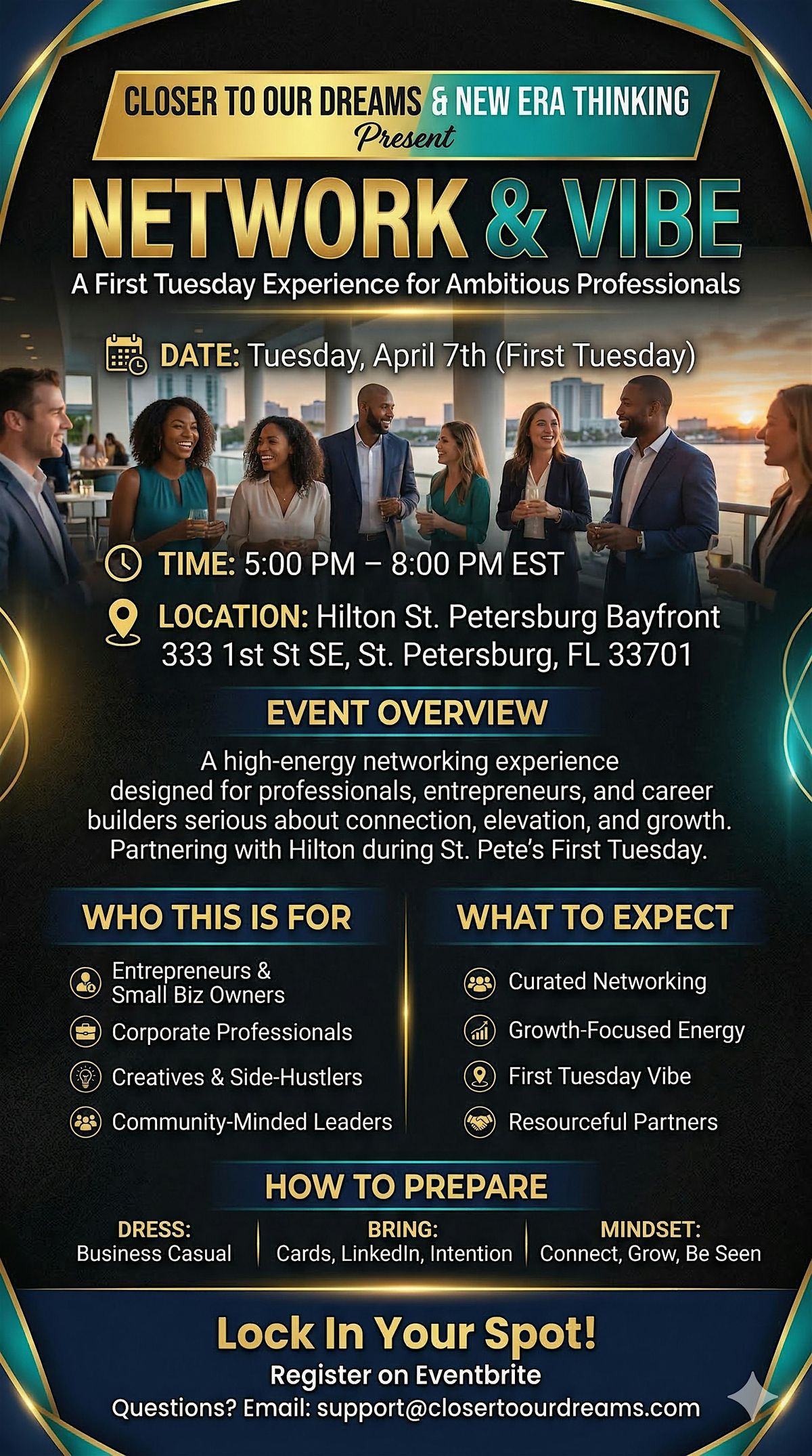 On Tuesday, April 7th, join Closer To Our Dreams and New Era Thinking for Network and Vibe—a high-energy networking experience designed for professionals, entrepreneurs, and career builders who are serious about connection, elevation, and growth.