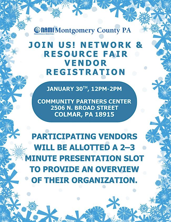 Come to NAMI Montgomery County PA's Network & Resource Fair! The event will take place on Friday, January 30, from 12:00 p.m. to 2:00 p.m. at the Community Partners Center (2506 N. Broad Street, Colmar, PA 18915).