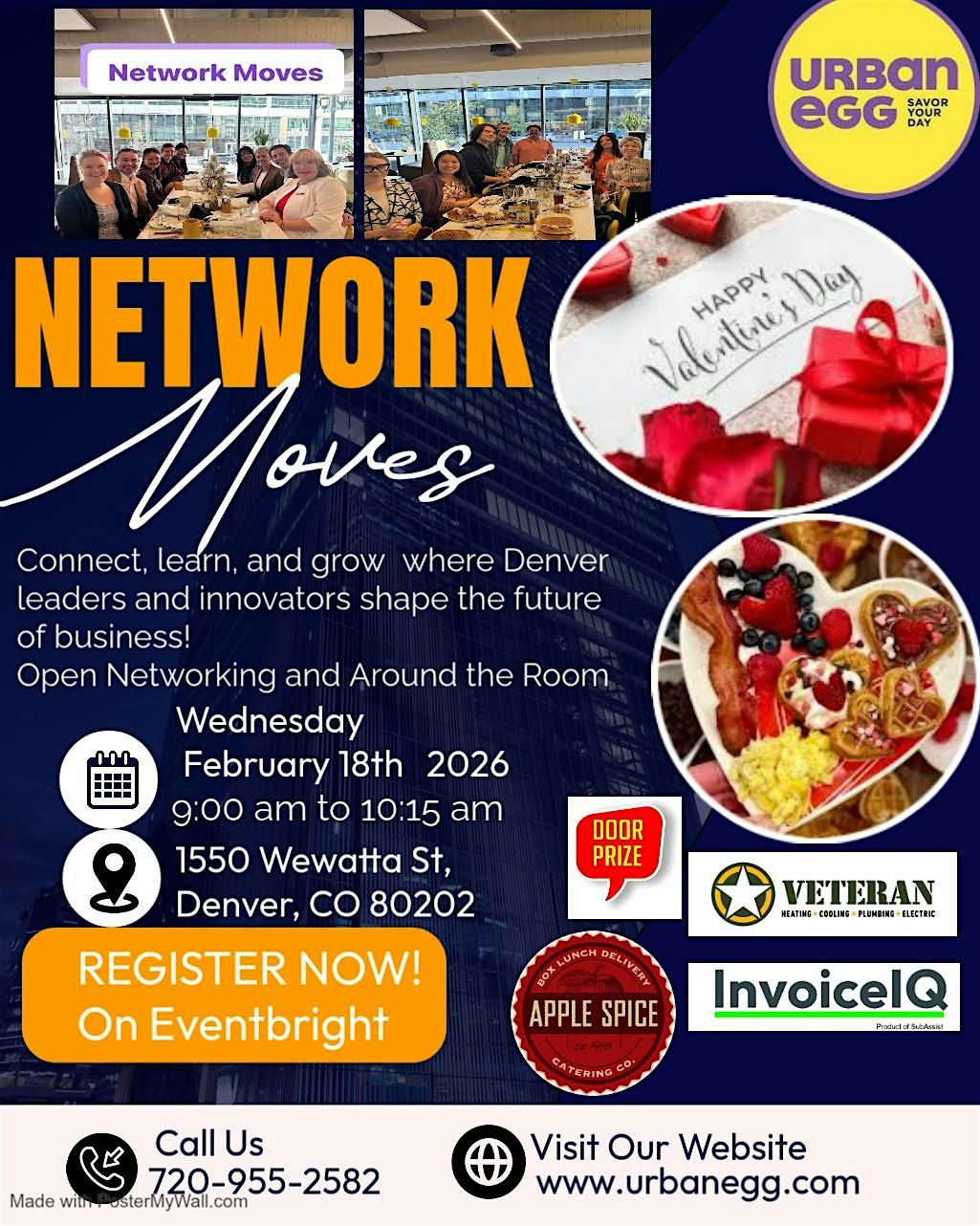 Network Moves Love for what we do edition at Urban Egg Connect | Learn | Grow. Join Denver’s top leaders and innovators for a powerful morning of connection and conversation as we shape the future of business together — right in the heart of Downtown Denver! Free Bites!!!!! Pancakes and Cinnamon Rolls Bites📍 Urban Egg, 1550 Wewatta St, Denver, CO 80202 📅 February 18th 2026 ⏰ 9:00 AM – 10:15 AM🤝 Open Networking + Around-the-Room Introductions 🎁 Door Prize: One Ultimate Whole Home Maintenance Agreement generously provided by Mike Townsend of Veteran Heating, Cooling, Plumbing & Electric Hosted by: Luis Sanchez Arica Netterville The Denver Business Beat Podcast Prize Sponsors: Veteran Heating, Cooling, Plumbing & Electric and Apple Spice Denver Come early, bring business cards, and be ready to build relationships that move business forward!