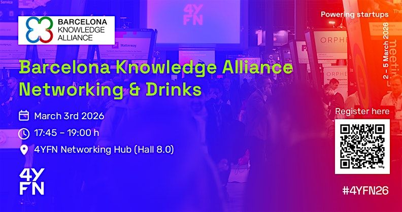 Et convidem a la sessió "Networking & Drinks" que tindrà lloc el dimarts 3 de març (17:45–19:00 h), dins del 4YFN del Mobile World Congress 2026.