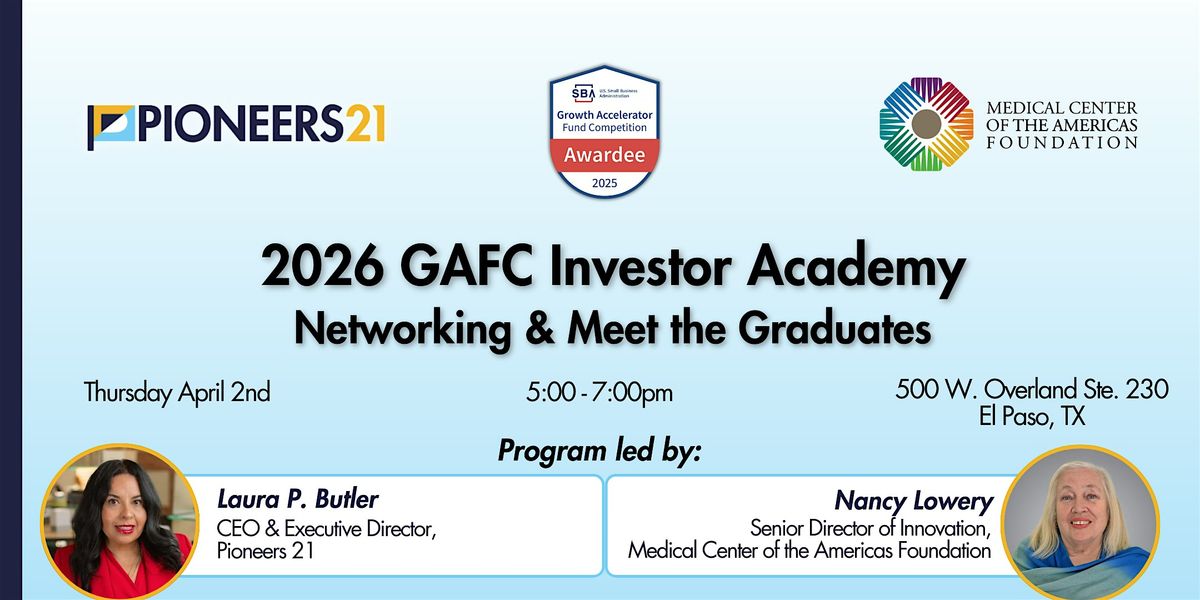 Join us for a networking reception following the GAFC Investor Academy Graduation, hosted by Pioneers 21 in partnership with the Medical Centers of America Foundation (MCA).