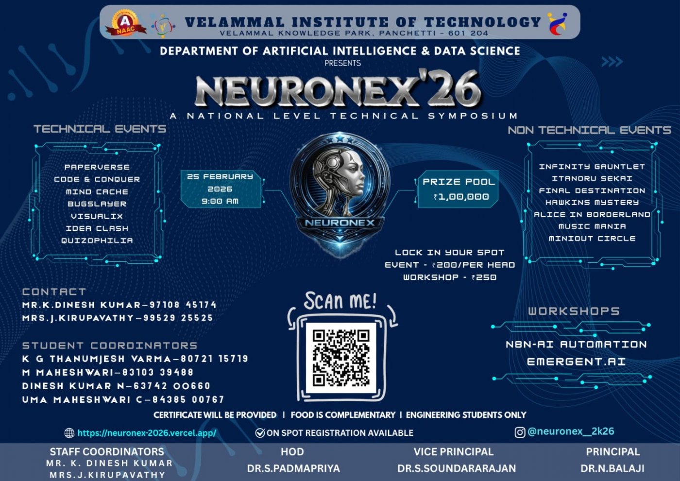 NEURONEX ’26 is a National Level Technical Symposium organized by the Department of Artificial Intelligence & Data Science, Velammal Institute of Technology. Designed as a platform where technology and fun collide, the symposium offers an engaging experience that goes beyond conventional technical events.