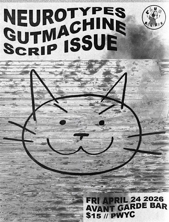 Neurotypes, Gutmachine from Scrip Issue play Avant Garde Bar on April 24th. Doors at 8:00. Show at 8:30.