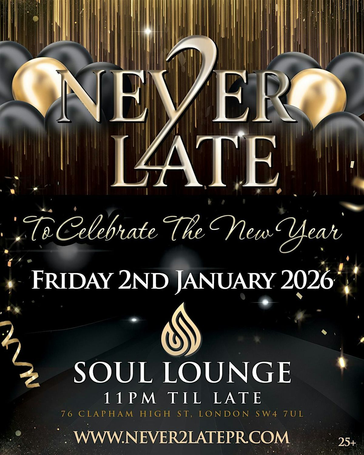 Join us at Soul Lounge, Clapham for an elegant yet electric night celebrating the New Year in true NEVER 2 LATE style. Expect a stylish crowd, high-energy atmosphere, and a soundtrack that blends R&B, Hip-Hop, Afrobeats, Amapiano, Bashment & Old School Classics — curated for those who appreciate quality music and a mature vibe.