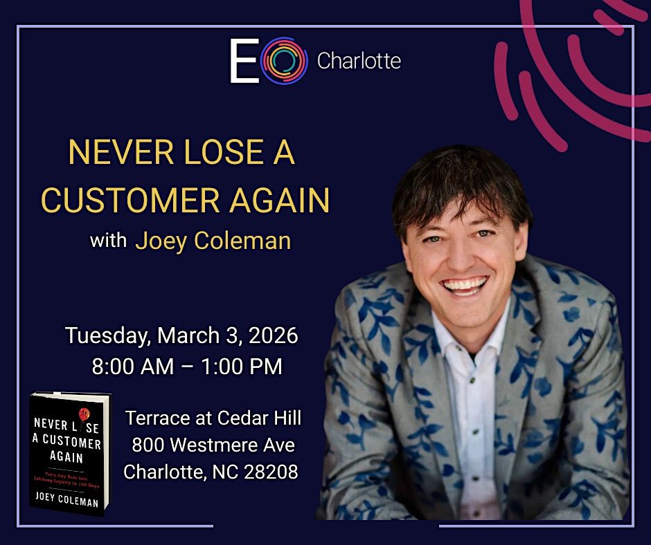 Join EO Charlotte for a high-impact Signature Event featuring bestselling author and customer experience expert Joey Coleman. This energizing half-day workshop will take place at The Terrace at Cedar Hill and is designed to help you intentionally create remarkable experiences that build lasting customer loyalty from day one.
