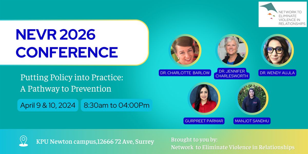 Welcome to the NEVR 2026 Conference! Join us at KPU conference center on April 9 &10, 2026 from 8:00 AM to 4:30PM (Pacific Time) for a day filled with insightful discussions on creating a pathway to prevention. This event aims to bridge the gap between policy-making and practical implementation in the field of prevention. Don't miss out on this opportunity to connect with industry experts and learn how to turn policy into action. See you there!