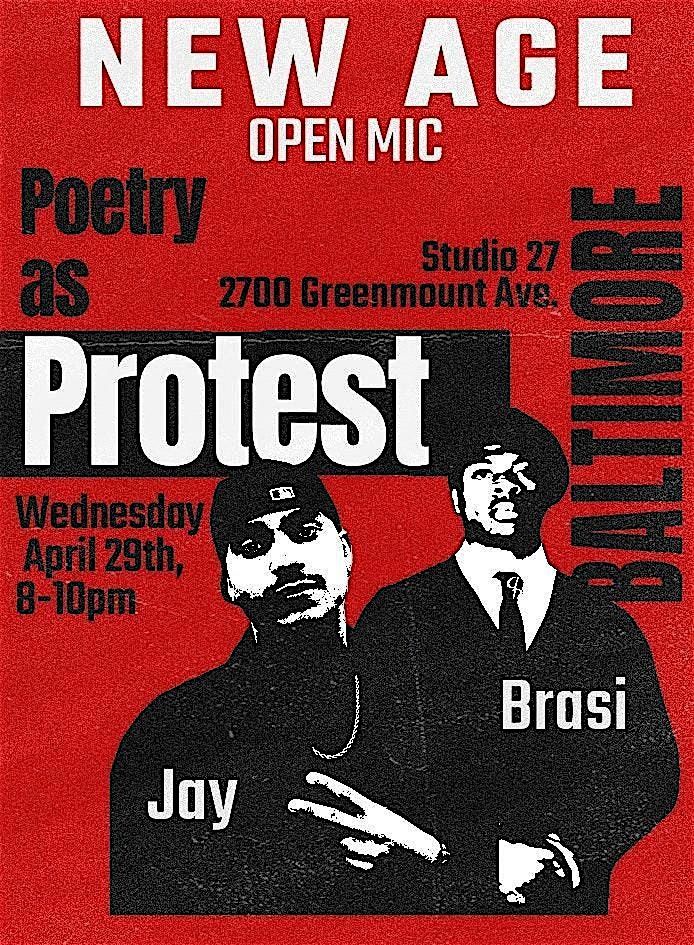 New Age Open Mic is coming to Studio 27 for a night of Poetry as Protest, where the personal and the political ignite the stage. We’re proud to feature Baltimore youth poets Jay Da Poet and Brasi, both repping Towson University.