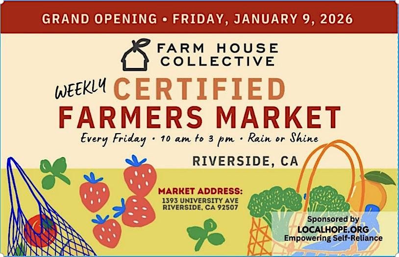 The new Farm House Collective Certified Farmers Market will celebrate its grand opening on Friday, January 9, at the Farm House Collective at 1393 University Ave in Riverside, located next to the University of California Riverside. It will continue to be held every Friday, 10am-3pm, rain or shine.