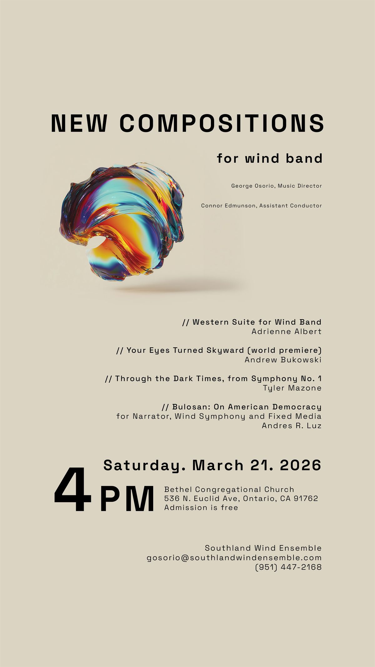 Under the baton of George Osorio, Music Director, the Southland Wind Ensemble presents a program that includes compositions for wind band that have been composed/arranged within the last 5 years, highlighting the ever-changing direction of wind band music.