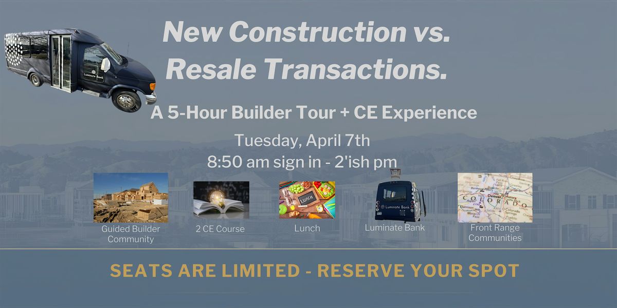 Hop on Dotty for a five-hour learning adventure with the Luminate Bank Builder Team! Climb aboard Dotty, our comfortable tour bus, as we explore new build communities in Northern Colorado. During our journey, you’ll participate in the “New Construction vs. Resale Transactions” course, a 2 CE Colorado Real Estate Commission-approved class designed to help brokers master the unique challenges and opportunities of new construction deals.