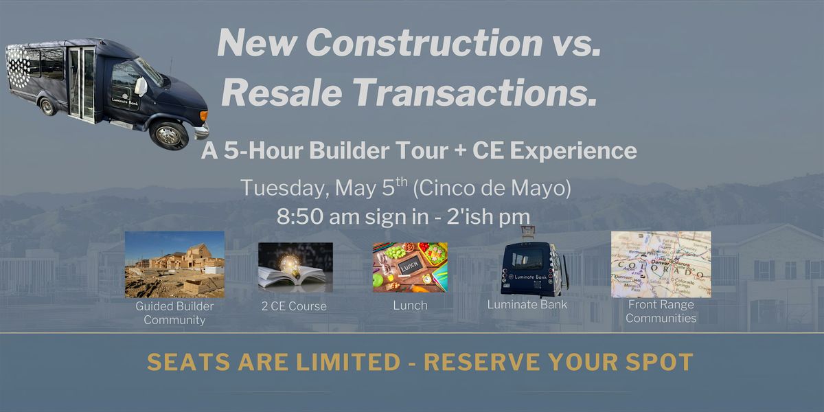 Hop on Dotty for a five-hour learning adventure with the Luminate Bank Builder Team! Climb aboard Dotty, our comfortable tour bus, as we explore new build communities in Northern Colorado. During our journey, you’ll participate in the “New Construction vs. Resale Transactions” course, a 2 CE Colorado Real Estate Commission-approved class designed to help brokers master the unique challenges and opportunities of new construction deals.