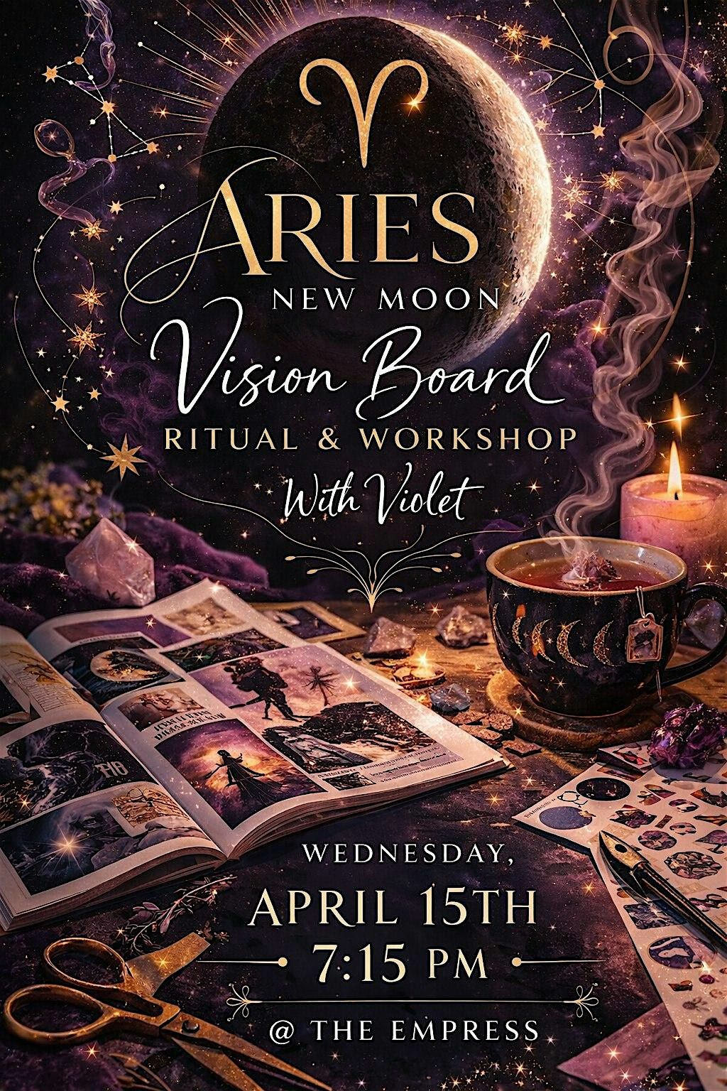 Join us for an in-person gathering to set your intentions under the powerful New Moon in Aries. New Moon Spell cookies and Tea will also be provided during workshop. To start the ritual we'll do a quick guided meditation spell to anchor in our intention. While you work on your boards I will read and talk about the New Moon in Aries energy and how you can sync into it for manifesting. When we’re finished do another quick guided meditation spell to anchor in our intentions. Here is a list of materials that will be provided: