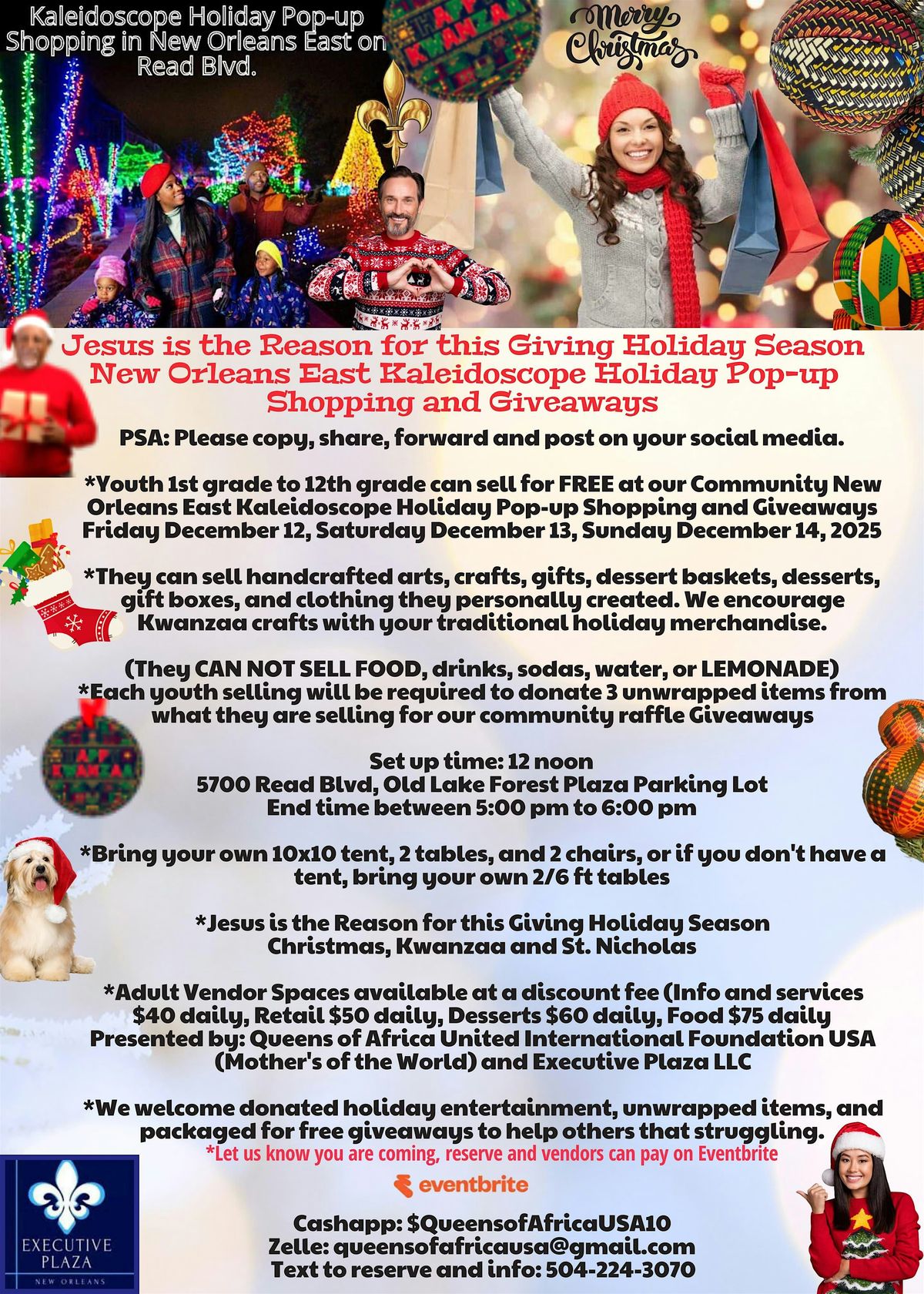 Welcome to the New Orleans East Kaleidoscope Holiday Pop-up Shopping on Read Blvd! Join us for a festive shopping experience at Read Boulevard East. Get ready to discover unique gifts, delicious treats, and one-of-a-kind finds from local, Greater New Orleans and afar vendors. Whether you're looking for holiday decorations, handcrafted jewelry, or tasty treats, you'll find it all here. Don't miss out on this special opportunity to support small businesses and find the perfect gifts for your loved ones. Christmas lights Celebration is Friday November 28, 2025 at Joe Brown Park